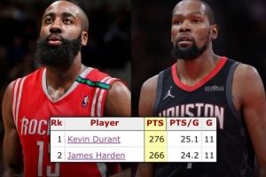 1. 杜兰特火箭生涯前11战合砍276分 超越哈登居队史第一